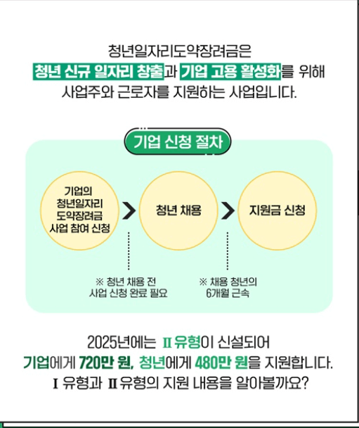 2025년에는 기존의 유형Ⅰ에 더해, 새롭게 유형Ⅱ가 신설되며 더 많은 기업과 청년이 참여할 수 있도록 문턱이 낮아졌습니다.