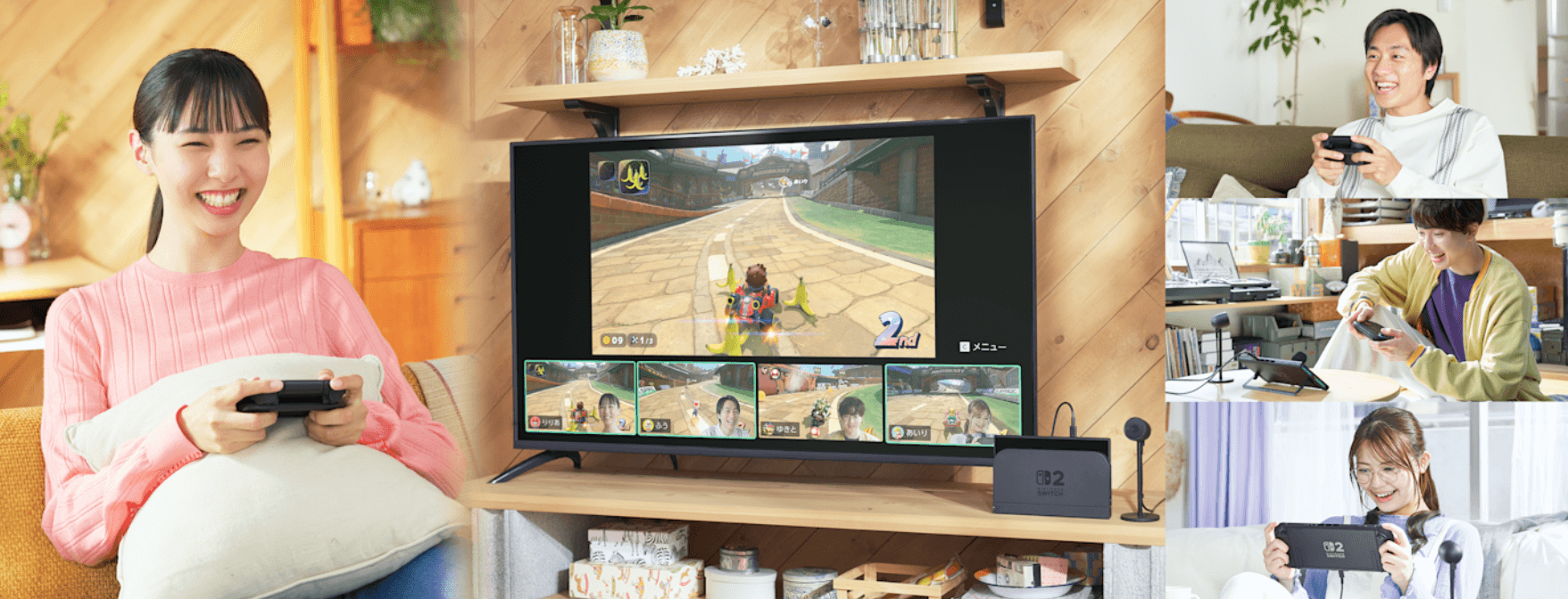 이번 모델에서 주목할 기능 중 하나는 게임챗입니다. Joy-Con 2의 전용 버튼을 누르면 간단하게 게임 중 음성 채팅이 가능하며, USB 카메라(별매)를 연결하면 영상 통화도 가능합니다. 최대 12명의 친구와 동시에 채팅하며 플레이할 수 있으며, 각자의 게임 화면을 공유하는 것도 가능합니다.