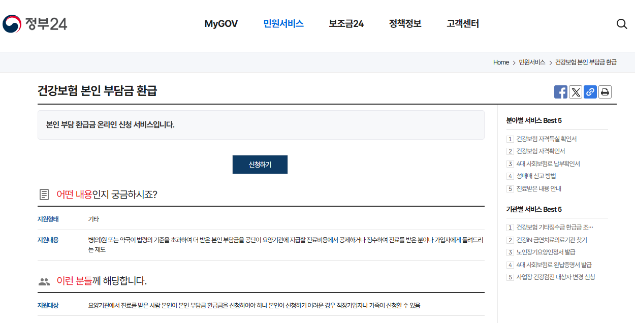 - 로그인 후 [보험급여] → [본인부담금 환급] 메뉴 선택