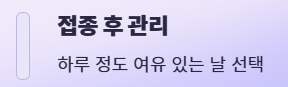 아래 추천 표에 따라 백신을 결정하셨다면, 병원 예약은 희망일로부터 1~2주 정도 여유 있게 상담과 예약을 진행하시는 것을 추천드립니다.